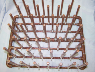 Daarna wordt er water geladen tot een bepaald niveau en start de pomp. De temperatuur zakt door het koude water in de afwasmachine tot zo’n 25 a 30°C. Na deze spoelbeurt wordt het water weg gepompt, hierna volgt de warme spoelbeurt, tevens wordt er een kleine hoeveelheid glansspoelmiddel gedoseerd. Maar wat wilde ik nu met die werkende afwasmachine, en nog belangrijker hoe kon ik bereiken dat elk fles van binnen en van buiten goed werd schoongemaakt. En zou de pomp het aankunnen om al die flesjes te voorzien van water en kwam er nog genoeg druk uit om de flessen aan de binnenkant goed schoon te maken? Zou de pomp de tegendruk aankunnen? Allemaal vragen waar op ik geen antwoord kon vinden. Het werd dus een grote gok. Ik wilde alles zoveel mogelijk in roodkoper uitvoeren omdat ik met testen van een stukje koper in de afwasmachine in onze keuken ondervonden had dat het goed bleef. Het uitvoeren in RVS zou helemaal mooi zijn maar zou het gelijk onbetaalbaar maken en het zou niet weggelegd zijn voor ons hobbyisten. Het principe van de constructie is gebaseerd op een grote H vorm van 22mm roodkoperen buis. Nadat alles in elkaar was gesoldeerd, de constructie goed schoongemaakt en ontdaan van alle soldeer resten heb ik voor het proefdraaien het contact van de deur overbrugd en de deur opengelaten en doorzichtig plastic voor de vaatwasmachine geplakt om alles goed te kunnen bekijken. Dit was zeer spannend, ik had er veel vrijetijd en geld in gestoken en het zou nu toch wel erg sneu zijn als dit mislukte. Ik wil nog even terugkomen op de staanders waarop de flesjes staan. De diameter van de de sproeigaatjes heb ik als volgt berekend. Nu moest ik gaan draaien met een beladen vaatwasser. Dit gaf nog problemen. De pomp viel bij de start telkens uit. Mijn zwager Siebe kwam met de oplossing, de pomp krijgt teveel tegendruk en valt dan af, je moet de constructie expres wat lekkage geven. Dit kon ik realiseren door de aansluiting van de H-constructie op de inlaat van de vaatwasser in de bak lekkend te maken. Dan nu de financieële kant van de zaak. De benodigde onderdelen: