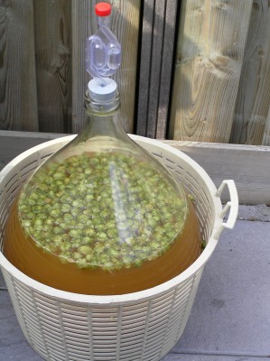 De mandfles staat nu in de koelkast bij circa 5 graden en af en toe komt er nog een luchtbel uit het waterslot. Voorlopig kan ie drie weken staan. Ben benieuwd wanneer de hopbellen zullen zakken. Wat mij betreft niet want zo drijvend is denk ik gemakkelijker om te hevelen.