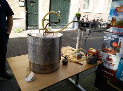 Mijn eerst brouwdag bij brouwvereniging 't Wort Wat! Lekker vroeg aanwezig op het Turfspoor. Het hele zooitje uit de auto gesjouwd, aangesloten, water in de verwarmingsketel en water in de maischpan. 30 liter wordt er vandaag gebrouwen. Loopt gesmeerd. Met de aanwezige schrootmolens ging alles lekker snel de pan in, althans… Het beslag was wel een beetje aan de dikke kant. En het geschrote mout ging maar net in de pan. Jongens, wat een dikke zooi. Temperatuur was niet te hoog. Nee, het was zelfs meer dan 5 °C te koud. Pomp stond aan, maar geen circulatie. Nee!! Filter verstopt. Onder in de maischpan zit een filter voor de pomp. Waarschijnlijk te hard gepompt. Na een half uur had ik weer een beetje beweging in de circulatie. Op naar de volgende maischstap. Nou ja, volgende maischstap… Nee, nog niet. Weer een verstopping. Weer een ruim half uur op mijn knieën zuigend aan een siliconen slang. Inmiddels zat er de kook bij de meesten al in. Dus al zuigend op mijn knieën werd ik inmiddels al door een paar man (met een lekker biertje in de hand) bekeken met de vraag wat ik in vredesnaam aan het doen was. Knoeien dus. Zweet op m'n kop, natte knieën en inmiddels een halfvolle maisch pan. Uiteindelijk de laatste maischstap overgeslagen en alles overgepompt naar de kookpan. Ja, dat ging goed. Kook zat er snel in. Hop erbij en nu kon bij mij ook de dop van de fles. Lekker biertje erbij en kijken hoe iedereen intussen aan het opruimen was.