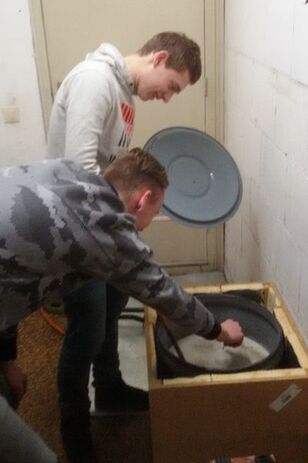 Wat zij de belangrijkste verschillen volgens mij tussen toen en nu? Er werd in elk geval niet gebotteld en dus ook niet op fles navergist. Er werd géén hop gebruikt. Er werden wél kruiden gebruikt. Er werd gemaischt volgens de decoctiemethode. Maisch schema ??? Schroten ??? Toch wilde ik graag de uitdaging aangaan. Reacties van o.a. Ernst gaven een goed idee over te gebruiken kruiden en na enig heen en weer gemail werd afgesproken op 2 februari 2016 bij mij thuis in Hillegom te brouwen. Voor de jonge brouwers een hele reis, zij kwamen uit de Achterhoek met twee lege jerrycans en ik heb hen in Nieuw Vennep van het station gehaald. Het volgende recept heb ik samengesteld voor 20 liter. Pilsmout 3 EBC, 5500 gram, geschroot. Munich 15 EBC, 1500 gram, geschroot. Gist Fermentis T-58 Maischen: 60 minuten op 65 graden, uitmaischen 5 minuten op 78 graden. Koken 60 minuten Kruiden 1e gift: Jeneverbes 20 gram, Koriander 10 gram, Zoethout 10 gram, Foelie 10 gram, Kamille (inhoud van een theezakje) alles 30 minuten. Kruiden 2e gift: Jeneverbes 10 gram 15 minuten, Koriander 10 gram 10 minuten, Zoethout 10 gram 10 minuten, Foelie 5 gram 10 minuten, Kamille (inhoud van een theezakje) 10 minuten. Dit gaf het volgende resultaat: s.g. na maischen 1,087 s.g. na filteren en spoelen 1,061, s.g. na koken 1,070.