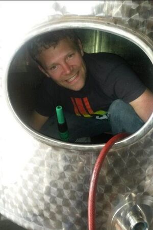 Nadat het maischen begonnen was konden de eerste schoonmaakwerkzaamheden beginnen. Er werd een vrijwilliger gezocht voor het schoonmaken van het 2500 liter gistvat waar ons polderbokje nu in aan het gisten is. Om praktische redenen, de grootte van het toegangsluikje, viel mij die ‘eer’ ten deel en dus mocht ik in het gistvat kruipen om de gistslurrie en het biersteen van de wanden af te schrapen. Kleddernat en onder de zooi kwam ik eruit, maar leuk om eens gedaan te hebben. Als er volgend jaar plek voor nieuwe leden vrijkomt in de commissie pleit ik ervoor dat we bij aspirant leden de buikomvang vragen en onze beslissing daarop baseren. Overigens is de tank na mijn handarbeid nog chemisch gereinigd en ontsmet, dus jullie hoeven niet bang te zijn voor een ietwat ziltige zweet smaak in jullie bier.