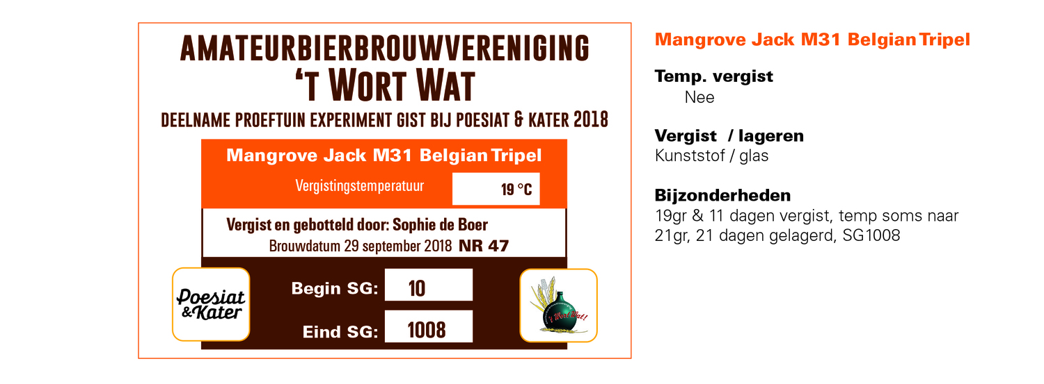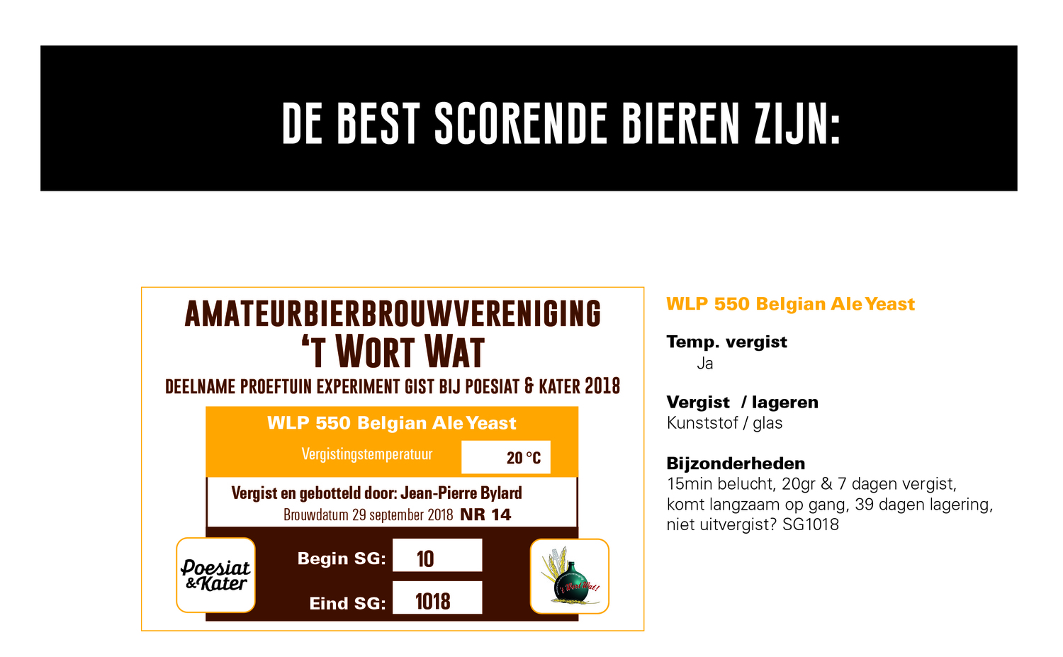 Begin 2018 is de proeftuincommissie van ’t Wort Wat gestart met het organiseren van een gistexperiment. Het doel was om, met als uitgangspunt één recept (in dit geval een Blond), de invloed van verschillende parameters op de smaak en beleving van bier boven water te krijgen en vast te leggen. Het bier is gebrouwen bij en door Poesiat & Kater in Amsterdam. De hoeveelheid te brouwen bier is vastgesteld op 1000 liter. Er hebben 50 brouwers ingeschreven voor 20 liter per persoon en 2 voor 40 liter per persoon. Er zijn 11 verschillende gisten geselecteerd om het bier mee te vergisten. Op 9 september 2019 is het bier gebrouwen en hebben alle deelnemers hun batches opgehaald bij Poesiat & Kater. Dat werd een feestelijke dag. Elke deelnemer kreeg gist mee, een vergistingsformulier voor de verslaglegging, etiketten voor de flesjes en een plaketiketje met het deelnemersnummer voor op de dop van de flesjes. Als laatste onderdeel van het experiment is er geproefd. Allereerst door de deelnemers zelf, op eigen gelegenheid. En vervolgens nog eens op een proefavond in clubverband in januari 2019. De proeftuincommissie heeft veel geleerd over de organisatie en de logistiek van een dergelijk experiment. Ook over de opzet, met name over het formuleren van een goede onderzoeksvraag. En natuurlijk over de smaak en de gedragingen van de verschillende gisten. In Dropbox zijn alle relevante documenten opgeslagen, waaronder een draaiboek, een begroting, een samenvatting van de ingevulde vergistingsformulieren en een verslag van de proefavond in clubverband van januari 2019. Uit de proefavond van januari 2019 (78 beoordelingen), aangevuld met de waarnemingen van thuisproevers (241 beoordelingen), kwam het volgende naar voren: