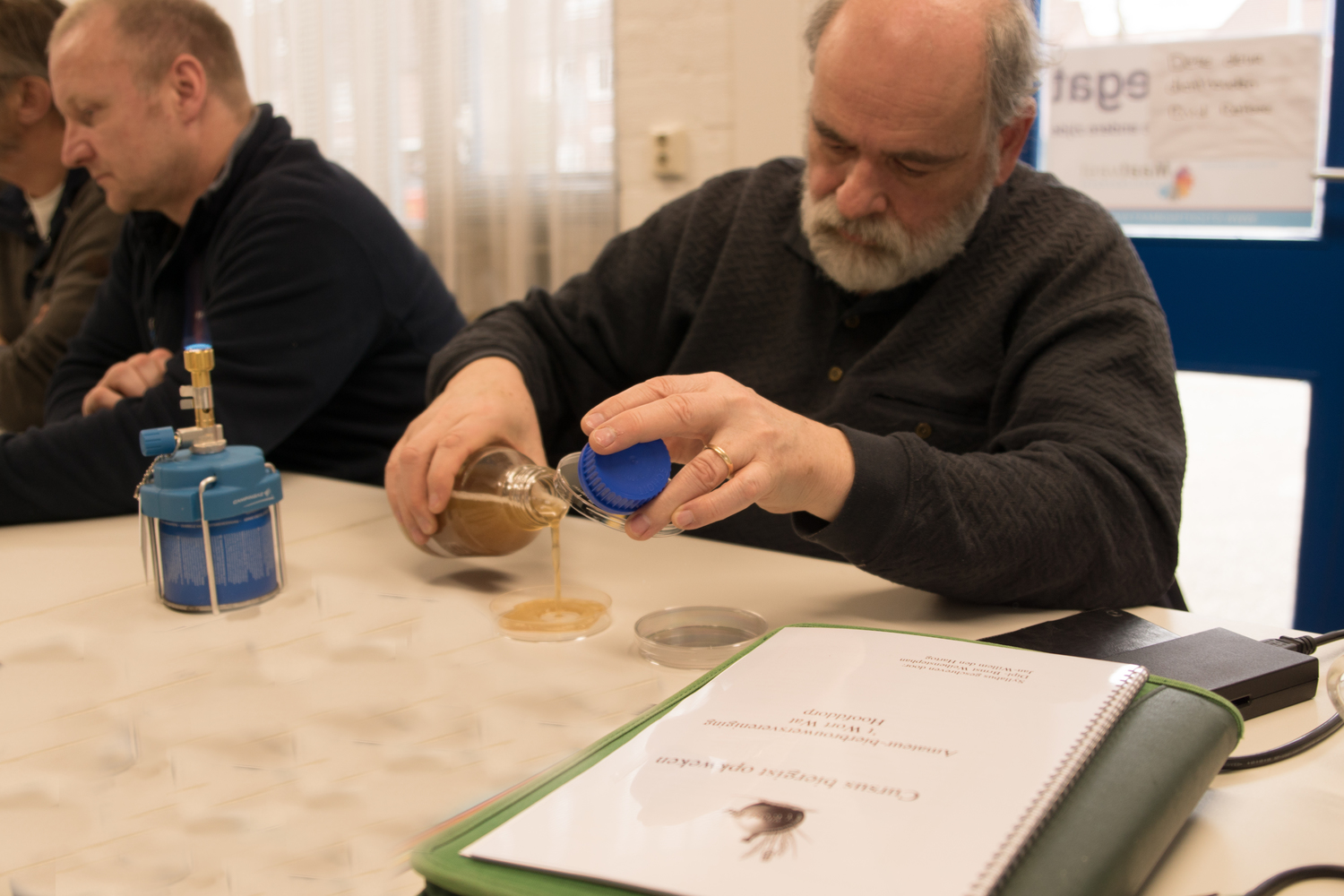 Vorig jaar tijdens de jaarvergadering werd aan de leden gevraagd wie zou willen assisteren bij de gistcursus en deze twee heren dachten meteen aan mij. En aangezien er geen reactie uit de leden kwam, kreeg ik een appje van Alex of mij dit leuk leek. Aangezien ik in een grijs verleden een laboratorium-opleiding heb gevolgd en de praktijk van microbiologie mij ook wel aansprak, leek mij dat wel leuk om te doen. Op zaterdag 23 maart was het dan zover. Die dag werd de gistcursus gegeven. Een cursus van 1 dag. Al vroeg uit de veren, want de cursus begint om 9:00 uur in Hoofddorp. Toen ik binnenkwam waren André van der Zee (cursusleider) en Walter Bakker (bestuurslid) al aanwezig.