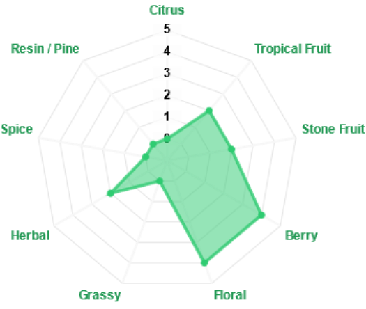 Volgens de specificaties van deze hop zijn er sterke aroma's van aardbei, besjes en framboos te vinden. Fruitigheid dus in de neus en ook in de smaak. Ook vind je informatie terug over enige citrustonen van mandarijn, sinaasappel en kumquat. Over de uitgesproken reuk en smaak van citroen en lemon niet trouwens, dus die scherp zure componenten zijn er dan weer niet. Niet te vergelijken met Citra dus, maar meer een subtielere frisheid. Ik denk dat het afhankelijk van de productielocatie, teeltmethoden en seizoensinvloeden, zoals zon en temperatuur, of je de citrustonen aantreft of niet. Kan per jaar verschillen, wijn kent ook topjaren en mindere. Dat zal bij hop niet anders zijn, het blijft een natuurproduct. Onderstaande grafiek komt overeen met de beschrijving van de raseigenschappen. Onze ervaringen in het gebruik