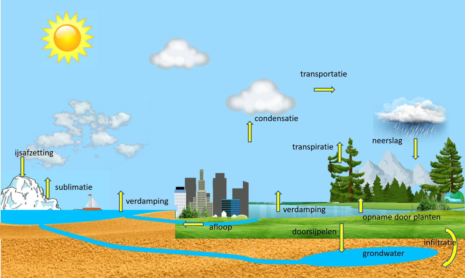 Waar komt (ons) water vandaan?De watercyclus op aardeWe beginnen met het beschouwen van de watercyclus met als startpunt het water in de fase gas of damp in wolken. Het water begint de cyclus als pure H2O (ook bekend als diwaterstofmonoxide of oxidaan), maar niet voor lang, want de waterdamp slaat uiteindelijk op aarde neer als regen, ijskristallen (sneeuw, rijp) of minuscule waterdruppeltjes (mist). Terwijl het water condenseert om waterdruppels te vormen, absorbeert het koolstofdioxide en andere gassen uit de lucht. De atmosfeer zit ook vol met stofdeeltjes en minuscule mineraalkristallen, zoals zand en natriumchloride. Al deze stoffen helpen waterdamp te condenseren, maar ze vervuilen ook het water tijdens de vorming van druppeltjes. De druppeltjes klonteren samen en vallen als neerslag (regen of sneeuw) op de aarde. Als de regen en sneeuw op de aarde vallen en zich verzamelen, openbaart het zich als oppervlaktewater. Hoe langer het oppervlaktewater in contact blijft met de aarde (dagen of jaren), hoe meer stoffen uit de omgeving erin opgelost of gesuspendeerd worden. Dit kunnen stoffen zijn afkomstig vanuit organisch materiaal van planten of dieren, andere verbindingen zoals herbiciden en pesticiden, en mineralen zoals natriumchloride en calciumsulfaat om er maar een paar te noemen.