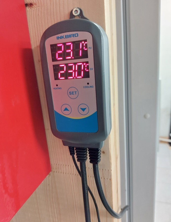 Voorkomen moet worden dat een verwarmingselement te zwaar uitgevoerd is om temperatuur‘pendelen’ te voorkomen. Idealiter is een smalle regelband voor een stabiele temperatuur. *De vraag is of een kleine (reis)föhn ook kan werken. Die ventileert ook gelijk de warmte door de kast en regelt directer omdat hij mogelijk na-ijlen van een thermo element bij uitschakelen voorkomt. Maar hoe die te bevestigen onderin de kast? Los laten liggen kan niet, de föhn blaast zichzelf dan van zijn plek. Tip: een computerventilator (met trafo) bij een vast bevestigd thermo-element voor luchtbeweging erbij kan uiteraard ook. En die maakt de regeling directer, dus effectiever. ThermostaatBij de flessen is de meetsensor te zien van de Inkbird klimaatregelaar. Dit is de thermostaat die koeling dan wel verwarming aanstuurt door spanning in (en uit) te schakelen op één van de twee.