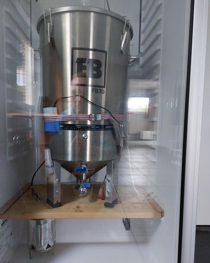 KoelkastenWat betreft koelkasten: uiteraard is een vriesvak niet nodig en die koelkasten zijn als tafelmodel redelijk voordelig nieuw te koop, maar let wel op de binnenmaten. In dit geval is het waarschijnlijk niet aan te raden om een tweedehandsje om te gaan bouwen voor 1 gistvat. Kan wel natuurlijk, als je er passend één vindt of al toevallig hebt. Verder is een tweedehands koelkast prima, als die maar koelen kan. Want bij gebruik als klimaatkast draait die koeling toch niet constant en al is het een beetje een stroomvreter, is dat geen ramp. Scheelt uiteraard wel in de aanschaf, als je er althans één vindt met de goede binnenafmetingen. Ook zijn er tegenwoordig modulerende koelkasten te koop. Die functie heb je zeker niet nodig, want je maakt alleen gebruik van de koelfunctie als de temperatuur oploopt in een klimaatkast. De gewenste temperatuur wordt al aangestuurd door een externe thermostaat – waarover later – en dus staat die kast niet continu te koelen. Die externe aan/uit regeling volstaat, maar zit er al een modulatieregeling in de koelkast ingebouwd, is dat niet erg. In het voorbeeld hieronder wordt uitgegaan van een klimaatkast voor 2 gistvaten en 2 mandflessen. Misschien is die extra ruimte wel handig, ook als je maar 1 gistvat en mandfles hebt. Stel je voor dat je flessen in de carbonisatie hebt staan en al wilt starten met vergisten van de volgende batch. No problem toch? Ruimte die je hebt vult zichzelf vanzelf op en je bent dan ook al toegerust op uitbreiding van je brouwliters in de toekomst. Twee gistvaten voorbeeldDus een koelkast zonder vriesvak met binnenruimte van minimaal 45 x 45 cm en 1 m hoogte boven de groentelade (en achterliggende koelmotor) is vereist. Of 1 meter 20 hoog indien er 2 mandflessen met waterslot erbovenop in moeten. Met – bij voorkeur – halverhoogte op 50 cm (of resp. 60 cm) schuifsleufjes voor een tussenrekje en ook een rekje onderin, boven de ruimte van groentelade en motor. Maar zelf halverwege een paar alu rails maken voor een rekje is evt. ook te doen met zelftappers o.i.d. Groentelade verwijderen, want daar komt het thermo element. Kan een verwarmingsrups zijn van 25 cm (of 50 cm als die erin past) of een Lighthouse ecoheat. Kost € 29,90 bij www.hobbybrouwen.nl. Zie foto van klimaatkast bij brouwerij De 7 Deugden in Amsterdam als voorbeeld.
