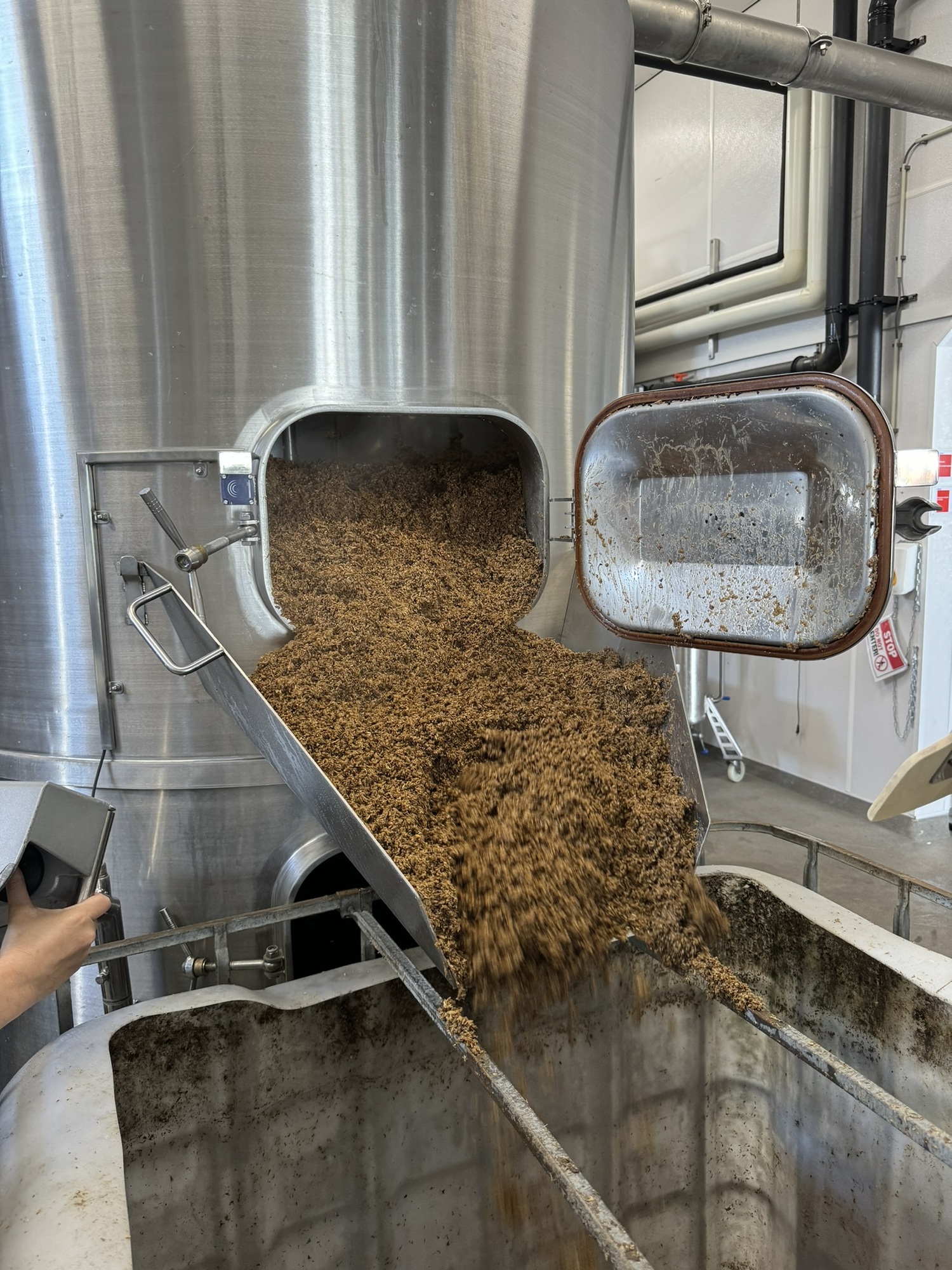Rond 10:30 uur was het maischschema afgerond en pompten we het geheel richting de filterketel om te klaren. Gelukkig geen verstoppingen in de leidingen. Het leuke aan deze installatie is dat na het maischen en koken gewerkt wordt met een filterketel. Deze opstelling komt niet vaak voor. Roanne vertelde dat dit voornamelijk is vanwege ruimtegebrek. In eerste instantie hebben we al 400 ltr in de ketel gestopt en tijdens het spoelen hebben we nog 110, 50, 50 100 en 50 ltr water toegevoegd waardoor we op een totaal volume van ca. 850 liter uitkwamen. Ondertussen was het vergistingsvat wat we gingen gebruiken ook leeg en konden we deze schoonmaken. Hiervoor gebruikten we de CIP (Cleaning in Place) en moesten we middels een hoop slangen, handelingen, loog, zuur en enzymen de ketel schoonkrijgen. Een behoorlijke klus! Rond 14:45 uur waren we klaar met klaren en pompten we het bier weer in de eerste ketel om het te koken. We namen tijdens het overpompen een SG meting en peilden 1,066. Dit is iets lager dan het recept maar hij zal door het koken nog een paar punten omhoog gaan.