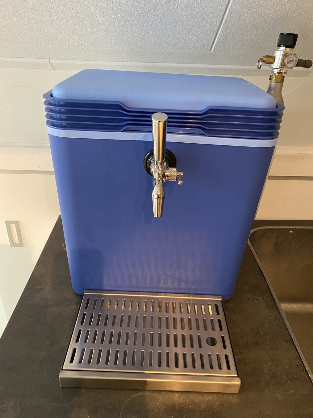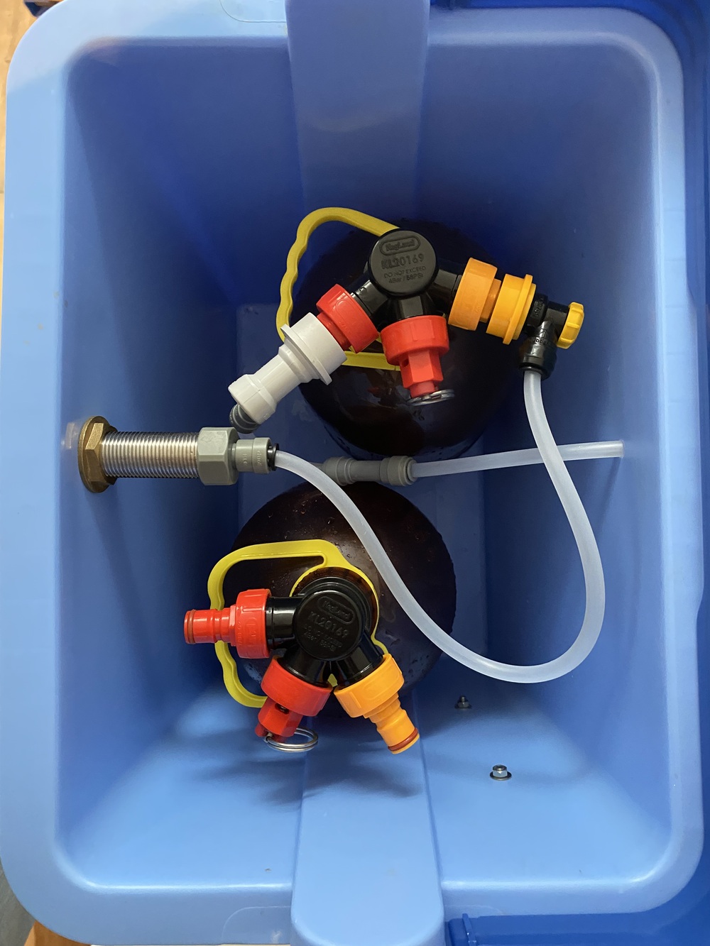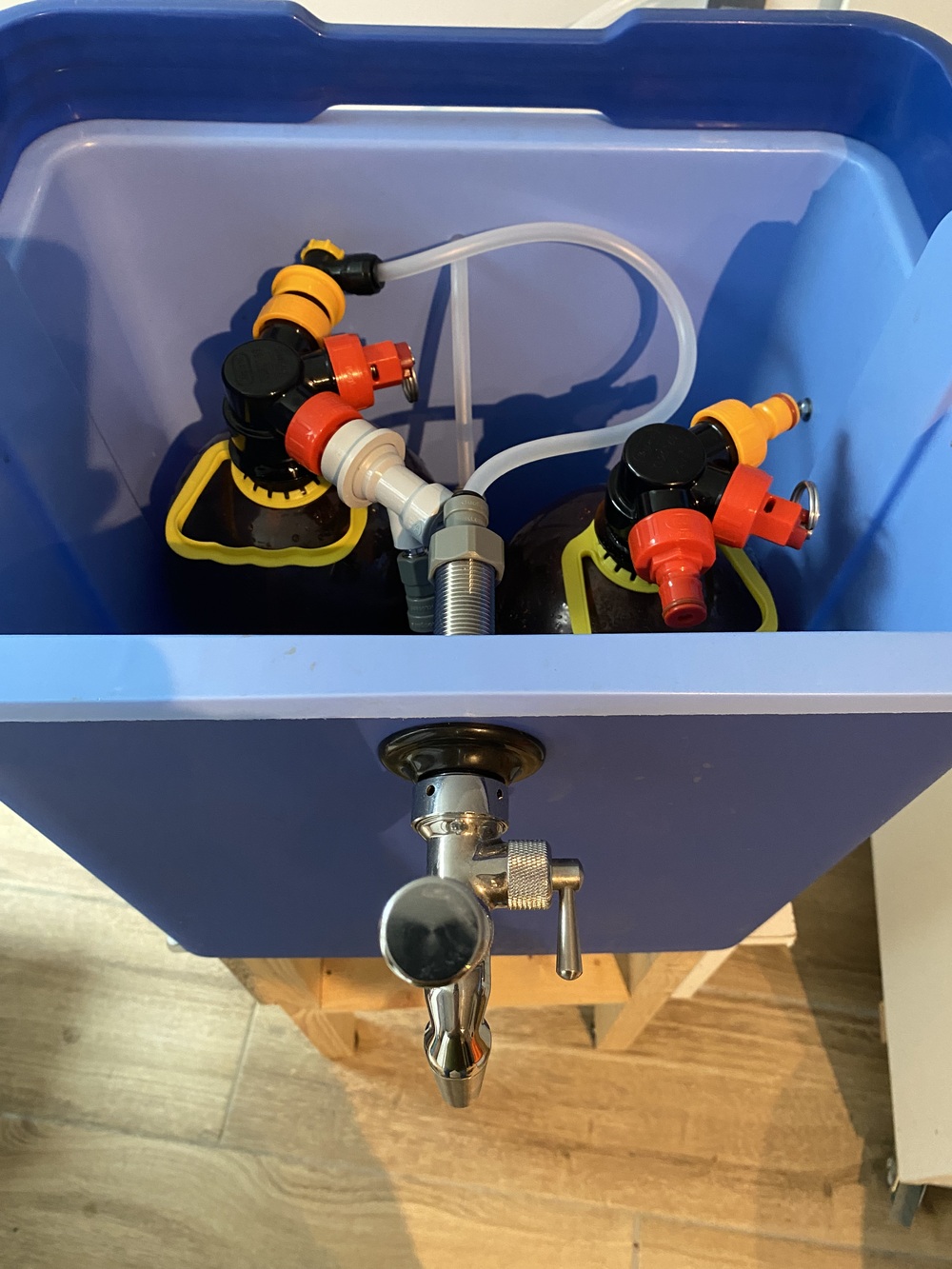 Na wat grasduinen op het internet kwam ik tal van voorbeelden tegen van zelfgemaakte thuistaps. Dat leek mij ook leuk om een keer te maken met de Oxebar 4-liter tankjes die ik al had. Dat resulteerde in een handzame partytap, die je ook nog eens een keer kunt meenemen naar visite of een feestje. Geen origineel idee van mij, maar een al bestaand en beproefd concept met een eigen twist. De basis zijn dus twee Oxebar 4-liter vaatjes. Die kun je overal online kopen, ik heb ze in de winkel van Brouwmaatje op de kop getikt. Voordeel van Oxebar is de prijs en het lage gewicht. Nadeel is dat ze door het lage gewicht makkelijk omvallen als ze leegraken en ze zijn natuurlijk minder duurzaam en kwetsbaarder dan RVS. René Nieuwenburg heeft in het vorige clubblad tegen het omvallen al een mooie oplossing gevonden met een 3D-geprinte houder. Mijn versie is wat luxer, maar is dan ook wel een stuk duurder. Koelen kan je met koelelementen (ik gebruik er drie) of ijsblokjes. Hiervoor is er ruimte genoeg.